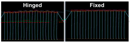 First, the connector B.C (Boundary Condition) effect is simulated and analyzed. As shown in Figure 10, two connector B.C models were established. In the hinged B.C model, each floating solar panel system moves independently, due to the moment transmission break, whereas the opposite is true with the fixed B.C model. Intuitively, it is expected that this varying moment transmissibility, due to the connector B.C, will cause overall dynamic behavior differences of the multi-connected floating solar panel system.