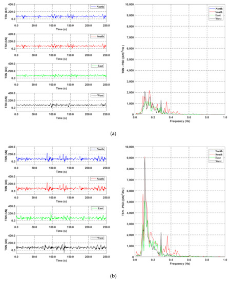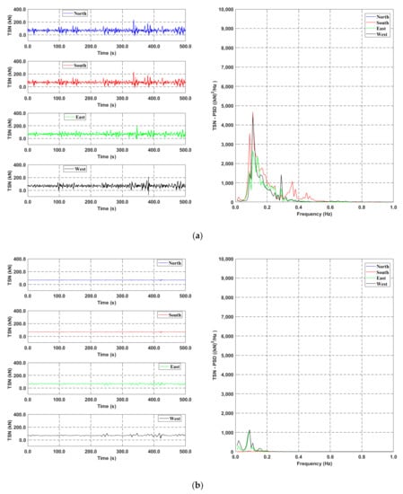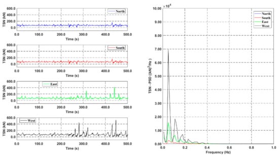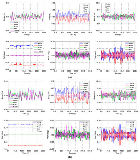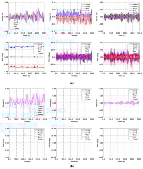 Figure 15 shows the corresponding mooring tension results of four locations (north, south, east, and west). Due to the dynamic response difference, the mooring tension variation of the hinged connector B.C was greater than that of the fixed connector B.C, even though they have similar initial mean tension values. Corresponding statistical characteristic results for floater motion and mooring tension are tabulated in Appendix A.