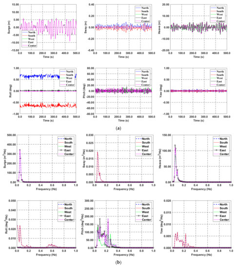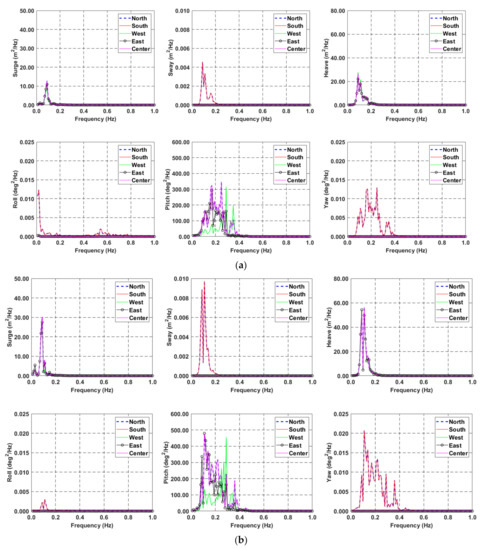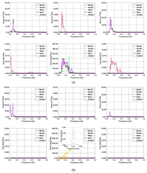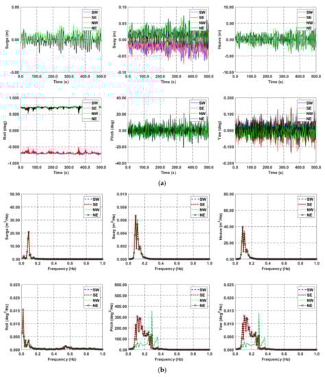 The floater motion time history and spectrum comparison results of the north, south, east, west, and center locations are presented in Figure 12 and Figure 13. There were notable dynamic responses along the sway, roll, and yaw directions, while the heading was 0° under the hinged connector B.C, whereas dynamic responses in the same directions could not be observed in the fixed connector B.C case. Furthermore, under fixed B.C, the dynamic responses at all measured locations were almost identical, as evidenced in Figure 12. This is caused by the moment–transmissibility effect. Under the hinged connector B.C case, the additional moment generated by the connector, caused by vertical or rotational movement of the facility, will affect the dynamic behavior of other facilities as another external excitation load. Furthermore, this unexpected dynamic response was observed in the north and south locations. This unexpected dynamic response was caused along the middle direction facility (east-center-west) under 0° heading. Thus, as further evidence, additional results at the corners (NE, NW, SE, and SW) are plotted in Figure 14. Unexpected dynamic responses at the corners (NE, NW, SE, and SW) were caused by the additional moment generated by the connector, due to the vertical or rotational movement of the system.