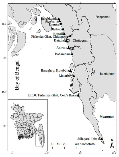 Map of the Bay of Bengal along the south-eastern coast of Bangladesh showing the sampling sites and fish landing centers.