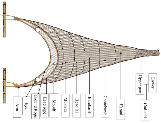 Chattogram and Cox’s Bazar district make up about 245 km of Bangladesh’s 710 km long, diverse coastline, covering the country’s south-eastern region. For the Bombay duck stock assessment, length data were collected from 13 local landing centers along the coast of Chattogram and Cox’s Bazar district based on the availability of the species throughout the year (Figure 1). The major fishing crafts in this fishery are non-mechanized and mechanized boats with various storage capacities. Set bag nets (SBNs), also known as behundi jal in the local communities, are the primary fishing gears used in Bombay duck catch, accounting for more than 95 percent of total landings [6] (Figure 2). Therefore, we collected the length data for this study from landing associated with SBNs. These nets have mesh sizes ranging from 2 to 10 cm at the mouth and 0.2 to 5 cm in the codend. Seine nets (mesh size: 0.5 to 6 cm), gill nets (mesh size: 2 to 10 cm), and trawl nets (codend mesh size: 1 to 5 cm) are also used by the fishermen for Bombay duck fishing.