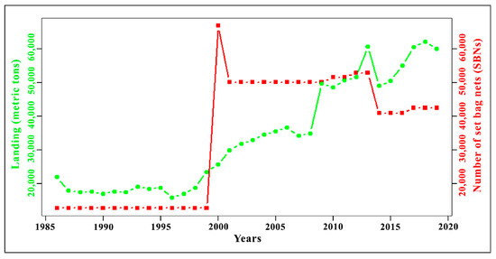 Trends in annual landing and number of set bag nets for Bombay duck in marine water of Bangladesh from 1986 to 2019. Here, green dots indicate the landing in metric tons, and red dots indicate the number of set bag nets.