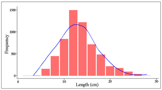 A total of 5921 individuals of the Bombay duck were measured for total length (TL) during the 12 months of this study (Table 1). The length–frequency distribution was found to be unimodal with one clear peak, and the modal size ranges from 11 to 12 cm, with around 40% of the fish samples being less than 12 cm (Figure 4). There was no spatial and temporal size difference observed during the sampling period.