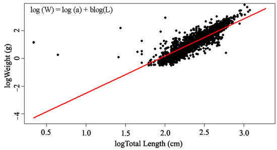 The parameters of the length–weight relationship (‘a’ and ‘b’) were estimated from the following formula proposed by Le Cren (1951) [35]: