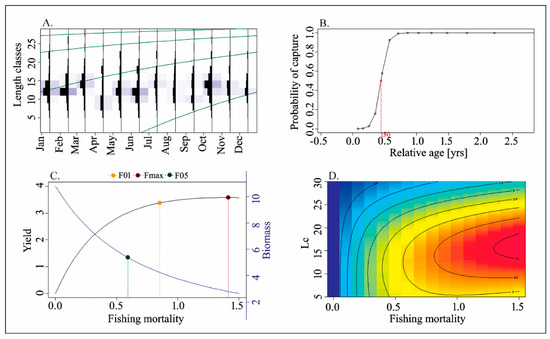 Based on a linearized length-converted catch curve, the estimated total mortality rate (Z) by ‘TropFishR’ is 3.06 year−1. The natural mortality (M) was then estimated as 1.199 year−1 using the method described by Then et al. (2015) [48]. Finally, fishing mortality (Fcurr) was calculated as 1.86 year−1 by subtracting M from Z. Table 3 summarizes the estimated biological reference points of fishing mortality and exploitation rate. Figure 6B–D show the graphical outputs of the catch curve and YPR model. The estimated present fishing mortality (Fcurr) is much higher than the optimum biological fishing mortality Fmax (1.41 year−1) and F0.1 (0.85 year−1). The present exploitation rate (Ecurr) is 22% above the threshold of Eopt = 0.5. The length at first capture (Lc) was estimated as 9.69 cm, implying that this length class has a 50% and length class 12.36 cm has a 95% probability of being captured when the total mortality (Z) is 3.06 year−1 under the present pattern of gear selectivity. The outputs also indicate that the maximum fishing mortality (Fmax) and exploitation (Emax) for optimum yield should be maintained at 1.41 year−1 and 0.46 year−1, respectively. Up to 50% of the stock’s biomass might be obtained at a rate of F0.5 = 0.59 year−1 and E0.5 = 0.19 year−1. On the other hand, the F0.1 and E0.1 values should be kept at 0.85 year−1 and 0.28 year−1 for the biologically optimal yield.