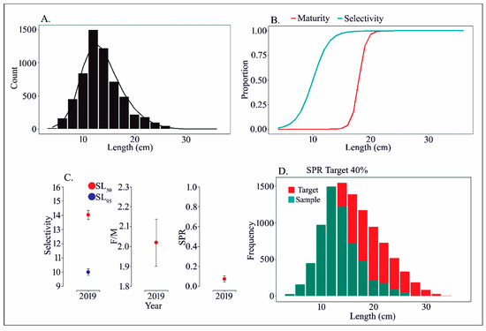The outputs of the LB-SPR model, showing: (A) length–frequency distribution of observed fished population, and the solid black line show the predicted fished size composition from the fitted LB-SPR model; (B) maturity and selectivity curve from the fitted LB-SPR model when L50% = 17.95 cm and L95% = 19.75 cm; (C) shows the distribution of mean selectivity parameters (SL50% and SL95%), fishing mortality to natural mortality (F/M), and spawning potential ratio; (D) observed size data against an expected size composition at a target SPR (0.4).