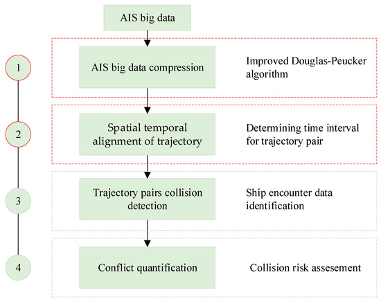 The purpose of this work is to evaluate the collision risk for vessels in specific water. The main contribution is divided into two parts. Firstly, the previous research work is improved and a new trajectory simplification method is designed. Secondly, a collision detection method between trajectories is proposed, which can effectively improve the efficiency of collision detection and reduce the difficulty of algorithm implementation. The framework of ship collision risk assessment is shown in Figure 2.
