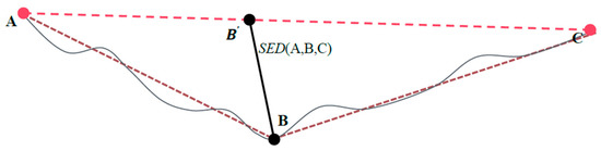 Synchronous Euclidean Distance. Where segment is the successive track points after compressing and point list is the successive actual location of the track. Point is the generated synchronization point. is the Synchronous Euclidean distance between the point and . The velocity of the Synchronized point B is , the time is and the course is .