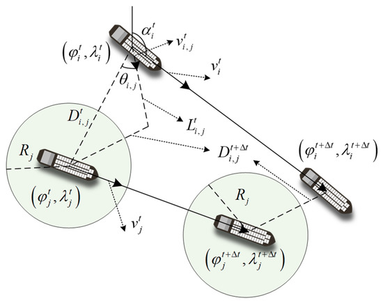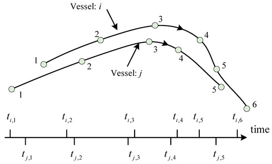 For example, in Figure 4, there are two trajectories labeled with a number from 1 to 5 and 1 to 6, respectively. Each trajectory has a series of waypoints and the arrival time at each waypoint was expressed as , where m is the index of a waypoint. According to the mentioned process, due to the arrival time of vessel i is less than at waypoint 1, therefore, the left value is equal to . Then, we can derive the right value by comparing the next adjacent arrival time and . Finally, the time interval is obtained, subsequently, with the repetition of processes, the time interval set can be determined as . In this study, the radius of the safety domain R is various lengths of vessels, which is set as three times the length of vessel referred [8].