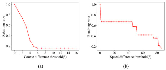 The relationship between retaining ratio and speed constraint or course constraint. (a) is the relationship between the retaining ratio and course constraint when the speed constraint is 87 and the threshold of the Euclidean distance is 100 times; (b) is the relationship between the retaining ratio and speed threshold when the course threshold is 27 and the threshold of the Euclidean distance is 100 times.