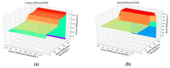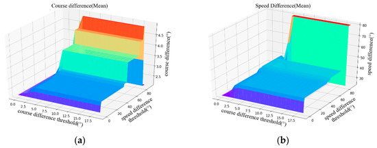 Correlation between the course difference threshold, speed difference threshold, and the mean error of course difference or speed difference. (a) shows the course difference; (b) shows the speed difference.