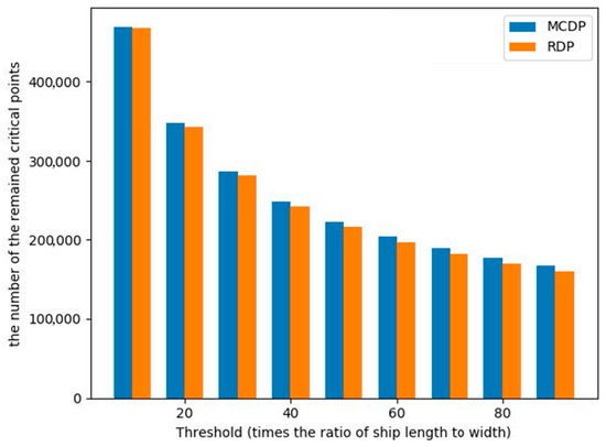 Figure 12 shows the comparison in terms of the number of the remained critical points in different times of ship length to width. From this, we can find that the number of the remained critical points of both methods decreases with increasing threshold and MCDP can remain much more critical points than RDP.