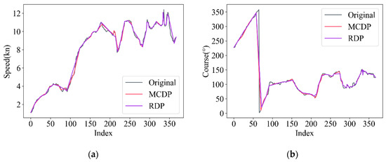 Charts comparing with the RDP algorithm and the MCDP algorithm (Our algorithm). (a) is the velocity simplification comparison with RDP, original, and MCDP; (b) is the course simplification comparison with RDP, original, and MCDP. The threshold was set as 50 times the ship length to width.