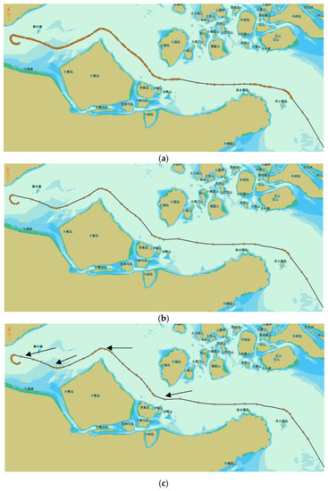 Compression results of vessel trajectory in the parallel experiment. (a) Original trajectory; (b) The simplified trajectory by RDP; (c) The simplified trajectory by MCDP.