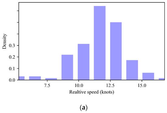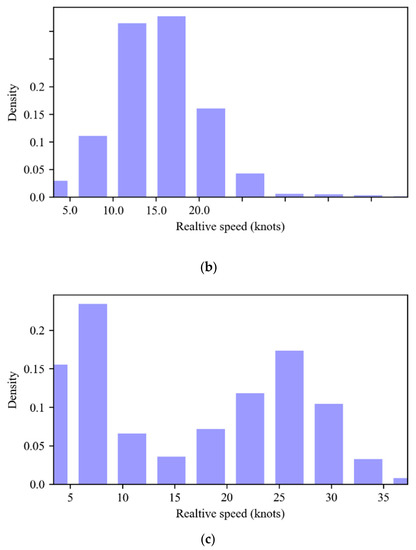 Relative speed distribution for vessels involving in different conflicts. (a) Head-on conflict; (b) Crossing conflict; (c) Overtaking conflict.