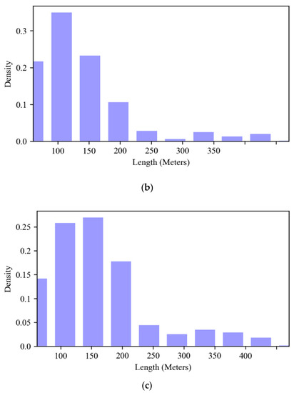 Length distribution for vessels involved in different conflicts. (a) Head-on conflict; (b) Crossing conflict; (c) Overtaking conflict.
