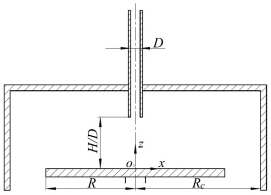 Figure 1 is a schematic diagram of a submerged jet impacting a stationary wall; the fluid was sprayed horizontally through a sufficiently long circular nozzle and impacted the wall of the stationary disk, forming the entire impinging jet flow field in the cylindrical water tank and finally flowed out through the gap between the stationary disk and the cylindrical water tank. The nozzle was perpendicular to the wall of the rotating disk, and its centerline coincided with the centerline of the disk. In order to better study the continuous jet impacting the stationary wall, a spatial right-angle coordinate system o1xyz was established. The coordinate origin o1 was the center of the disk, the z-axis was perpendicular to the disk wall, and the x-axis and y-axis were perpendicular to each other and parallel to the wall of the disk. In order to investigate the general law of impinging jets, the fluid domain above the disk was taken as the study object, and the size and spatial position of the model are dimensionless, with the inner diameter D of the nozzle. The inner diameter of the nozzle D = 10 mm, the outer diameter Dw = 12 mm, the radius of the cylindrical flume Rc = 25D (250 mm), and the radius of the stationary disk R = 15D (150 mm). The correctness of the numerical simulation model was verified by comparing the numerical simulation results of the axial distribution of the dimensionless velocity of the jet with the experimental results of the PIV.