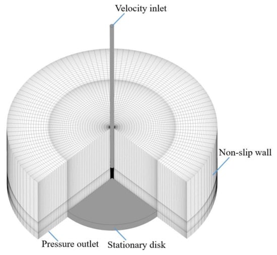 For the numerical calculation of impinging jets, compared with unstructured grids, structured grids have the advantages of easier fitting regional boundaries and more accurate simulation of flow details [38]. Therefore, the model was delineated with a hexahedral structured mesh using the professional commercial software ANSYS ICEM CFD 19.2 [39]. A hexahedral grid can effectively reduce the pseudo-diffusion caused by poor grid quality and can also improve the computational speed. The grid was encrypted near the impact wall where rapid changes in velocity and pressure occurred by controlling the number of grid nodes. It was ensured that the aspect ratio of the grid and the dimensions between adjacent grids would not differ significantly and that the angle was greater than 18° and less than 90°. The grid node spacing of the first layer on the impact wall was set to 0.1 and gradually increased in the ratio of 1.1 away from the impact wall, to realize the encryption of the boundary layer.