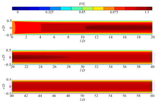 Figure 5 shows the distribution nephogram of the dimensionless velocity V/Vj in the cross-section in a circular pipe of length 60D. As can be seen from the figure, with the flow of the fluid, the velocity of the fluid near the wall of the pipe decreases due to the viscous shear stress. The velocity of the main flow in the pipe first increases and then remains unchanged, and a high-speed core region appears. As the flow develops, the high-speed core region gradually narrows and then disappears; the high-speed core region arises at about L/D ≈ 10.5 and disappears at L/D ≈ 28. When L/D ≥ 30, the distribution of dimensionless velocity V/Vj on the cross-section of the pipe remains constant.
