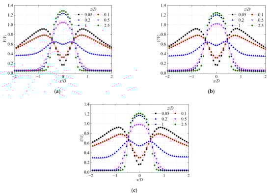 Figure 9 shows the distribution of the dimensionless velocity V/Vj along the radial direction x/D in the midsection (xoz plane) of the continuous jet impinging on the stationary wall jet with different Reynolds numbers and H/D = 3 conditions. It can be seen from the figure that, under the same Reynolds number, in the free-jet region (z/D ≥ 1), the radial distribution of the dimensionless velocity V/Vj varies less along the radial direction as the axial height z/D decreases; in the impact region (0 ≤ z/D ≤ 1), the radial distribution of the jet’s dimensionless velocity V/Vj changes greatly with the decrease in axial height z/D. When the Reynolds numbers are different, there is no significant change in the distribution of the dimensionless jet velocity V/Vj along the radial direction at the same axial height z/D. It is shown that, for a continuous jet impacting a stationary wall, at the same impact height, the jet flow structure is relatively independent of the Reynolds number.