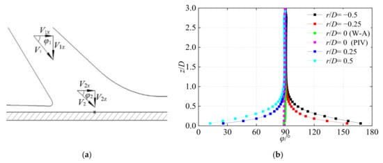 The flow angle φ represents the angle between the flow direction at any point in the cross-section of the flow field and the +x axis, and is given by φ = arctan (−Vz/Vx), as shown in Figure 11a. Figure 11b shows the axial distribution of the flow angle φ at different radial positions in the cross-section of the continuous jet impinging on the stationary wall jet under the condition of impact height H/D = 3 and Reynolds number Re = 35,100. It can be seen from the figure that the flow angle of the jet’s central axis of remains unchanged at 90° and the numerical calculation results are basically consistent with the PIV experimental results. The axial distribution of the flow angles at radial positions symmetrical about the axis of the jet is symmetrical about 90°; at the axial position 1 ≤ z/D ≤ 3, the flow angle φ remains constant at 90°; at the axial position z/D = 1, the jet turns and the flow angle φ starts to change.
