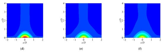 Figure 12 shows the flow structure diagram on the cross-section xoy of the impinging flow field under the conditions of Re = 35,100, H/D = 2 and 8. From the streamline diagram, we can infer that when the cross-sectional height z/D = 0.5, the fluid spreads from the center to the periphery; the flow direction changes and moves in the circumferential direction near the wall of the sink. When the cross-sectional height z/D = 1, the environmental fluid flows toward the edge of the jet due to the jet’s entrainment near the center of the jet. As the cross-sectional height z/D increases, the turning position of the fluid is gradually close to the wall of the tank; the jet velocity increases, the diameter becomes smaller, the coiled suction effect is enhanced, the range of flow to the center of the jet becomes larger, and the range of flow to the surrounding area becomes smaller.