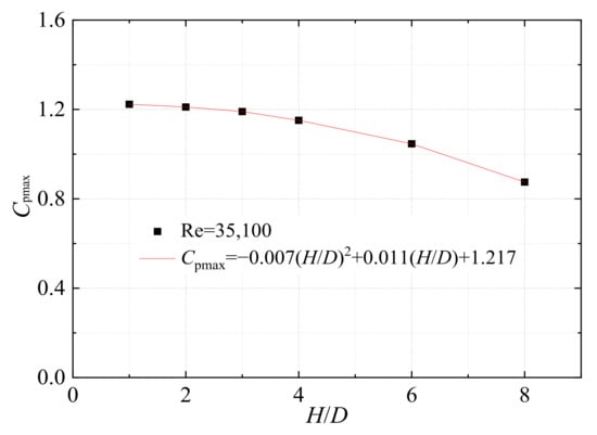 Figure 17 shows the variation in the maximum pressure coefficient Cpmax on the impact wall with the impact height H/D and is fitted with a curve. The fitting formula is