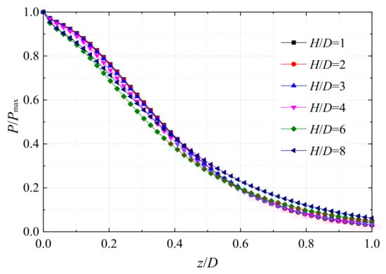 The maximum impact pressure Pmax is used for the dimensionless treatment of the impact pressure. Figure 18 shows the axial distribution of the dimensionless pressure P/Pmax on the axis of the jet at different impact heights. It can be seen from the figure that the axial distribution of the dimensionless pressure P/Pmax on the axis of the jet at different impact heights basically coincides, and the maximum impact pressure is reached at the impact wall. This shows that the pressure distribution on the central axis of the impinging jet at different impact heights has a good similarity. At the same time, we can observe that the figure shows a clear inflection point at z/D = 0.3. The reason is that the fluid is ejected through the nozzle, due to the influence of the surrounding stationary environment fluid, and the axial velocity is rapidly reduced and converted into the pressure energy of the jet as the jet approaches the impact wall; the growth rate of P/Pmax then rises. As the impinging jet gradually approaches the wall, the axial velocity of the jet rapidly becomes zero within a short distance, the kinetic energy contained in the axial velocity of the jet is all converted into pressure energy, P/Pmax reaches its maximum value, and the growth rate of P/Pmax decreases in the near-wall area, resulting in an obvious inflection point in the image at z/D = 0.3.