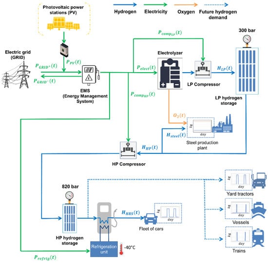 A PEM electrolyzer was chosen to produce high-purity hydrogen. The performance characteristics of the electrolyzer were evaluated on the basis of existing applications [1,10]. The electrolyzer is powered by electricity coming from the electric grid and/or from the PV plant, depending on the best strategy defined by the Energy Management System (EMS). It was assumed that excess electricity coming from the PV plant can be sold to the grid. The cost of the water flow feeding the electrolyzer was not considered in the calculation, since in Italy, it has a limited impact on the total production cost of hydrogen (<1%) [12]. Hydrogen produced at 30 bar is then compressed to 300 bar by a reciprocating compressor. This pressure level was chosen to find a compromise between the cost and volume occupied by the storage system. Compressed hydrogen could be used directly in the steel production plant or stored at 300 bar in the here called Low-Pressure (LP) storage system. The remaining part is further compressed to 820 bar and stored in a High-Pressure (HP) storage system for feeding the HRS. This pressure level allows the fast fueling of cars, without the use of compressors for transferring hydrogen to the vehicle tanks with a storage pressure of up to 700 bar. A refrigeration unit was considered at the dispenser to guarantee a hydrogen temperature during refueling of −40 °C [22]. The orange line in Figure 1 indicates the oxygen flow produced in the electrolysis process. While oxygen production was not considered in the optimization model, it could represent an additional revenue for the plant. The dashed blue lines indicate possible hydrogen demands for other vehicles that operate in the port and that could be included in the future.