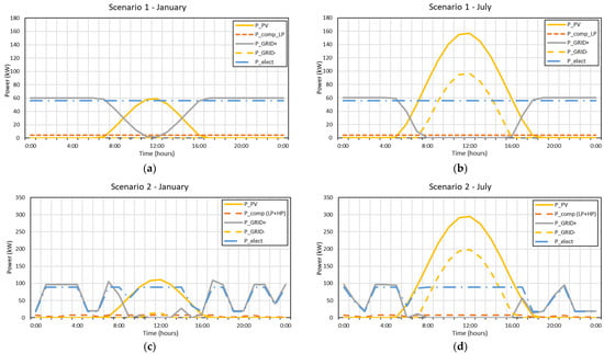 Results of D&O optimization for Scenario 1 (a,b) and for Scenario 2 (c,d). Power flows at the EMS level are shown for a typical winter day (15th January) and for a typical summer day (15th July). The solid yellow curves are the power produced by the PV power plant, the dashed yellow curves are the power sold to the grid, the solid grey curves are the power purchased from the grid and the dashed blue curves are the power required by the electrolyzer. The dashed orange lines represent the power demand of both the LP and HP compressors.