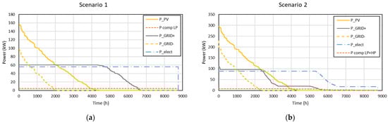 Figure 2 shows the results of D&O optimization for Scenario 1 (Figure 2a,b) and Scenario 2 (Figure 2c,d). Power flows at the EMS level are shown for both scenarios during a typical winter day (15th January) and a typical summer day (15th July), while duration curves for the optimal plant operation over the whole year are reported in Figure 3.