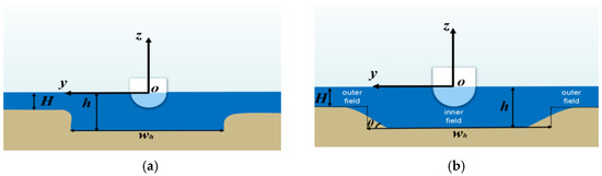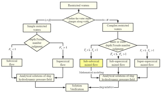 Then, supposing the inner and outer Froude numbers for depth are defined as and , respectively, where h or H is the water depth in the inner or outer domain, respectively (h > H), and g is the gravitational acceleration. As is known, whenor <1, it is subcritical, or conversely, it is supercritical. Therefore, there are three main types of mixed flow in the complex restricted waters, because of the different or , as shown in Figure 2. For example, a sub-subcritical mixed flow means that it is subcritical speed in the inner domain and subcritical speed in the outer domain, while a sub-supercritical mixed flow means that it is subcritical speed in the inner domain but supercritical speed in the outer domain, and so on.