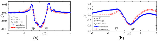 Equation (47) is used to calculate the ship hydrodynamic pressure field on the bottom, and the calculated results were compared with the experimental results of the literature [14,15,16], based on the ship B data. The ship longitudinal pressure curves at y=0 are shown in Figure 5, which presents that the calculated and experimental curves are more consistent, meanwhile, the magnitude and location of the calculated negative peak are very close to the experimental data. However, there are some differences between their positive peaks, because the calculation is based on a pointy-tailed Wigley ship, but the experiment is based on a square-tailed ship.