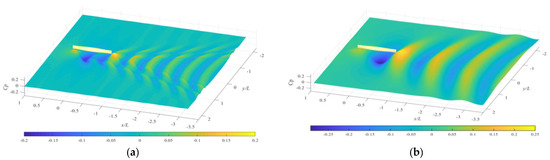 Meanwhile, the three-dimensional distribution of ship hydrodynamic pressure field at different speeds is calculated and shown in Figure 6. It can be seen that the pressure field at Fh = 0.56 presents a combination of transverse and dispersive wave characteristics, but as the speed increases to Fh = 0.8, the negative peak gradually moves towards the ship stern and the pressure field mainly presents transverse wave characteristics. Thus, it is obvious that there are differences in the characteristics of the ship hydrodynamic pressure field at different speeds