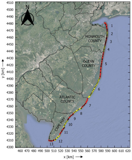 Study area location. Alternating red and yellow lines depict NJ Shoreline Segments utilized by Lemke and Miller [38] to produce the storm erosion potential climatology. Segments are numbered from north to south with #1 at Sandy Hook and #13 at Cape May. NJ coastal are counties labeled accordingly. Black + markers depict NJBPN survey locations. Map coordinate system is NAD83/UTM Zone 18N in kilometers. Courtesy of [20].