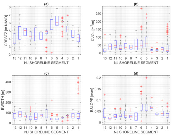 Spatial variance for select Resilience parameters by segment. (a) Dune crest elevation; (b) Dune volume; (c) Berm width; (d) Beach slope. Presented by segment, south (13) to north (1). Red horizontal bar—median value, blue box—25th and 75th percentiles. Outliers defined by 1.5 × IQR away from 25th/75th percentiles. Courtesy of [48].