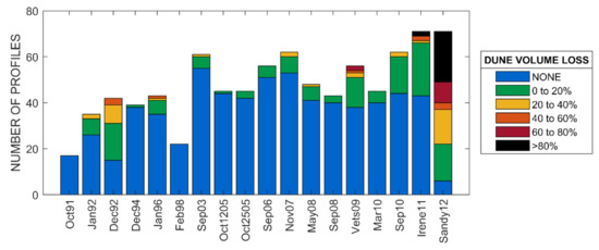 Aggregated summary of quantity of profiles available and corresponding dune volume loss percentage by storm for the New Jersey coast. Courtesy of [20].