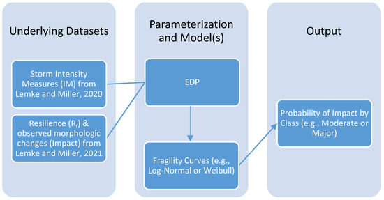 This workflow is visually summarized in Figure 4. This paper makes extensive use of two existing datasets characterizing the storm intensity measures (IM) [38] and beach morphology parameters [20]. Morphology parameters include both the Resilience (Rf) parameters (e.g., beach characteristics including width, volume, etc.) and the Impact (i.e., observed dune volume loss for a given storm). The data are recast into the EDP by combining the IM and Rf from previously published datasets. The EDP is then used as a physically based parameter to fit fragility curves to predict the observed Impact classes. The EDP is the argument, and the probability of class is the return.