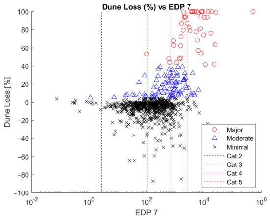 The observed dune loss percent vs. storm intensity for the entire dataset is presented in Figure 5. Colored dots denote observed Major (red) and Moderate (blue) damage classifications. Minimal impacts are denoted by x’s. Negative dune loss denotes accretion of the dune. (Potential causes and the treatment of these datapoints are discussed in Section 3.5). While the storm intensity measure alone (PEI) appears to separate the data, use of the EDP (Figure 6) improves the clustering by damage classifications. In Figure 6, the storm Categories (measure of PEI alone) are converted into an EDP using the median dune volume and berm width. Other EDPs (Cases 1–6, 8) had similar effect. However, generally speaking, clustering was improved for EDP cases that considered both berm width and dune volumes.