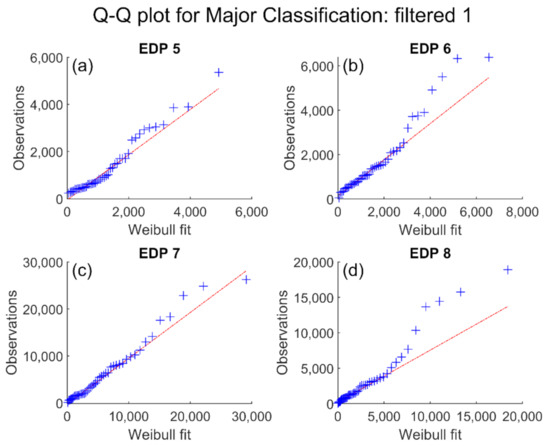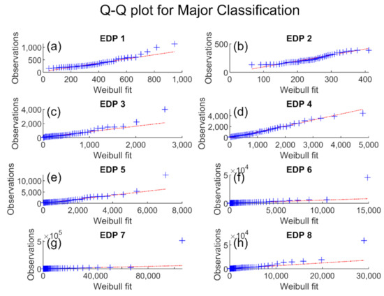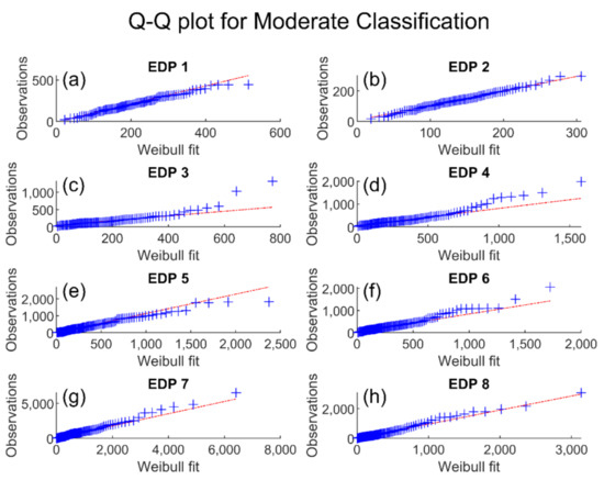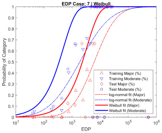As an alternative to the log-normal distribution, a Weibull distribution was fit to the Moderate and Major classifications using only the observations corresponding to each classification. The CDF of the two-parameter Weibull function, as modified to use the EDP, is shown in Equation (5):