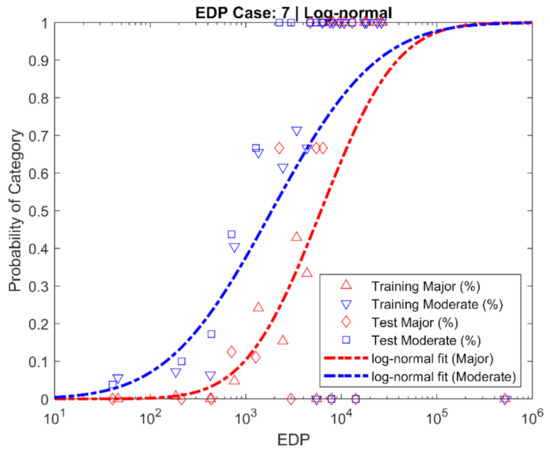 The log-normal distribution is shown in Equation (4). The left-hand side of the equation states that the probability of category can be estimated by the EDP. The probability is estimated as the log-normal cdf evaluated at a given EDP and two fit parameters, θ and β. The parameters θ and β define the median of the distribution (i.e., the EDP measure corresponding to 50% probability classification) and the standard distribution (commonly referred to as the dispersion), respectively.