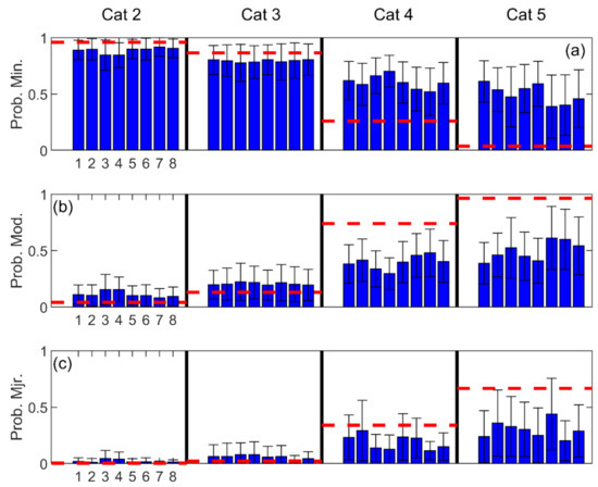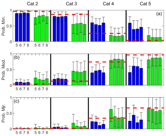 To reduce the influence of this uncertainty, the fragility models are fit to predict categorical response of the dune impacts for a given storm intensity in lieu of a regression analysis (e.g., predicting percent dune loss or volume loss). Categories for response are based on the percentage of dune volume loss as presented in Table 6 and are identical to those established by Lemke and Miller [20]. The Major threshold was based on empirical evidence in the aftermath of Hurricane Sandy dunes with volume losses greater than 40% generally exhibited evidence of overwash, as characterized by a lowering of the post-storm dune crest elevation. The onset of overwash is attributed with greater impacts (damages) to upland assets and, thus, a useful delineation in the prediction of storm damages.