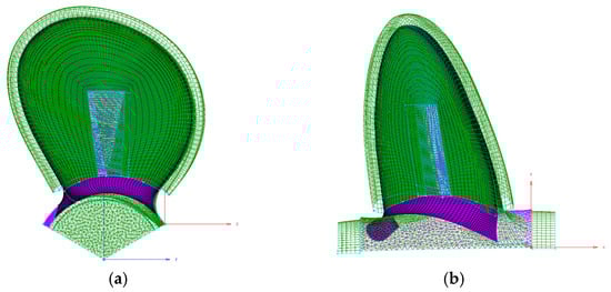 In order to save computing resources for the propeller, which has rotational periodicity, a volume that had one third of a cylinder was selected as the computational domain, as shown in Figure 4. The computational domain is composed of an inner rotating domain and an outer stationary domain []. The radius of the stationary domain is 5D, where D is the nominal diameter of the propeller. The outlet boundary is 13D away from the propeller, while the inlet boundary is 5D away from the propeller. The radius of the rotating domain surrounding the propeller is 1.5D and its axial length is 0.5D.