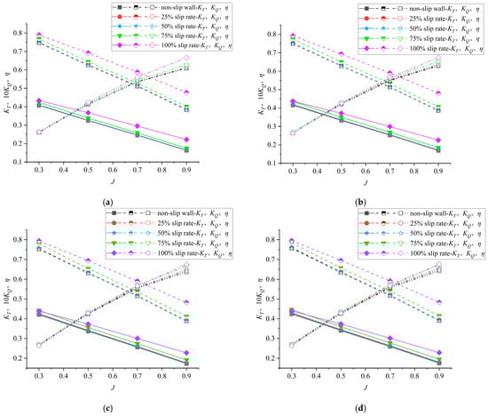The propeller performance results are shown in Figure 5. Hydrodynamic parameters of the conventional propeller using non-slip wall condition and the propellers coated with the hydrophobic material using wall boundary conditions with different surface slip rates are compared.