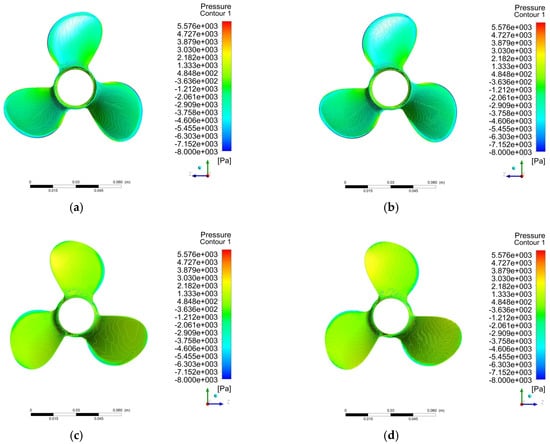 Propeller blade pressure. (a) Conventional propeller, suction surface. (b) Propeller coated with the hydrophobic material, suction surface. (c) Conventional propeller, pressure surface. (d) Propeller coated with the hydrophobic material, pressure surface.