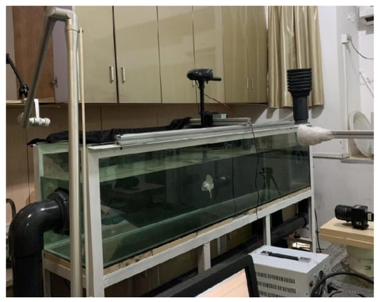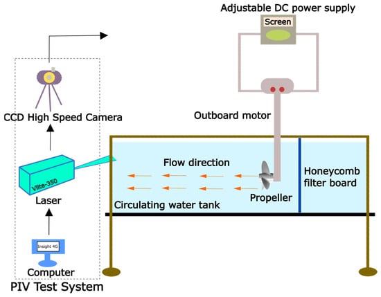 The experimental platform shown in Figure 10 and Figure 11 was used to measure the flow characteristics of the propellers. The platform was mainly composed of a circulating tank, a honeycomb filter plate, a propeller, an outboard motor with an adjustable DC power supply, and a Particle Image Velocimetry system (PIV) [,]. The tank was mainly made of plexiglass material, with a size of 2100 mm × 420 mm × 500 mm. A honeycomb filter plate was installed to make a uniform water flow.
