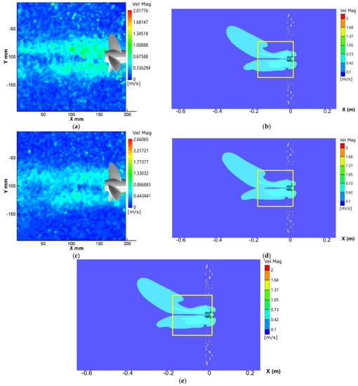 In Figure 12, the PIV velocity fields were more symmetrical than CFD results. That can be explained as a so-called frozen-rotor interface was used to describe the interface condition between rotor domain and surrounding stationary domain, so the “frozen” propeller had an influence on flow field symmetry. Since the propeller was a three-blade one, the propeller’s influence on flow in the cutting plane of Figure 12 was asymmetrical.