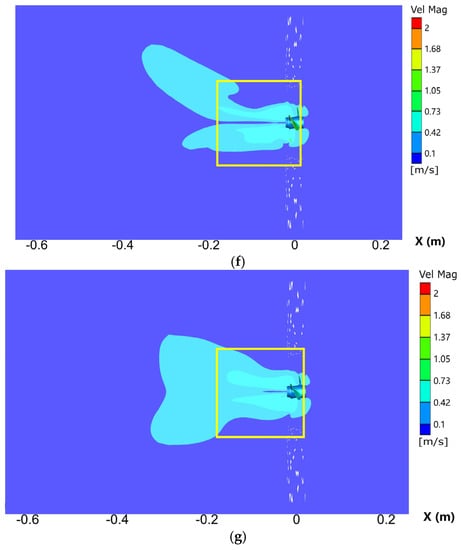 Figure 12 shows the velocity magnitude on the plane located at the rotating axis of the propellers. For the conventional propeller, both the PIV result in Figure 12a and CFD result in Figure 12b show that there was a significant low-speed wake region downstream of the propeller hub represented by the dark blue color, which extends from the propeller hub to the surrounding low speed region. However, for the propeller coated with the hydrophobic material, both the PIV result shown in Figure 12c and CFD result assuming a 75% slip rate shown in Figure 12d show clearly a shortened low-speed region downstream of the propeller hub, represented by the dark blue region with a length of about 0.15 m, on the left part of the propeller hub. The CFD results, assuming a 25% surface slip rate shown in Figure 12e and a 50% surface slip rate shown in Figure 12f, show that the low-speed region behind the hub has not been shortened, extending into the surrounding low speed region with a pattern similar to the flow of the conventional propeller. Figure 12g shows the CFD results assuming a 100% surface slip rate, indicating that the low-speed region downstream of the propeller hub disappears within a very short distance, represented by the dark blue area with a length of only about 0.07 m behind propeller hub. Based on the above mentioned comparisons, the CFD result assuming 75% surface slip rate was the closest to the experimental result of the propeller coated with the hydrophobic material.