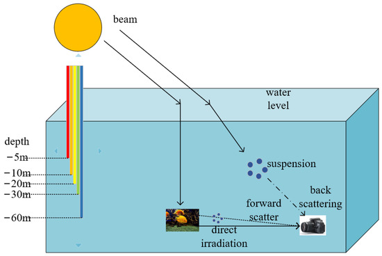 The process of underwater imaging is shown in Figure 1. As light travels through water, it is absorbed and scattered. Water bodies have different absorption effects on light with different wavelengths. As shown in Figure 1, red light attenuates the fastest and will disappear at about 5 m underwater, blue and green light attenuates slowly, and blue light will disappear at about 60 m underwater. The scattering of suspended particles and other media causes light to change direction during transmission and spread unevenly. The scattering process is influenced by the properties of the medium, the light, and polarization. McGlamery et al. [2] presented a model for calculating underwater camera systems. The irradiance of non-scattered light, scattered light and backscattered light can be calculated by input geometry, source properties and optical properties of water. Finally, the parameters such as contrast, transmittance and the signal-to-noise ratio can be obtained. Then, the classical Jaffe–McGlamery [3] underwater imaging model was proposed. It indicates that the total illuminance entering the camera is a linear superposition of the direct component, the forward scatter component, and the backscattered component