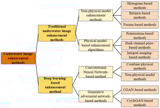 In recent years, deep learning has been widely applied in image processing due to its powerful classification performance and feature learning ability, and underwater image enhancement algorithms based on deep learning have also developed rapidly. Based on the differences in the deep learning network models, they can be divided into convolutional neural network (CNN) and generative adversarial network (GAN) methods.